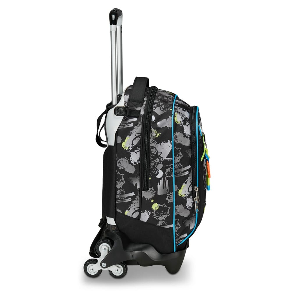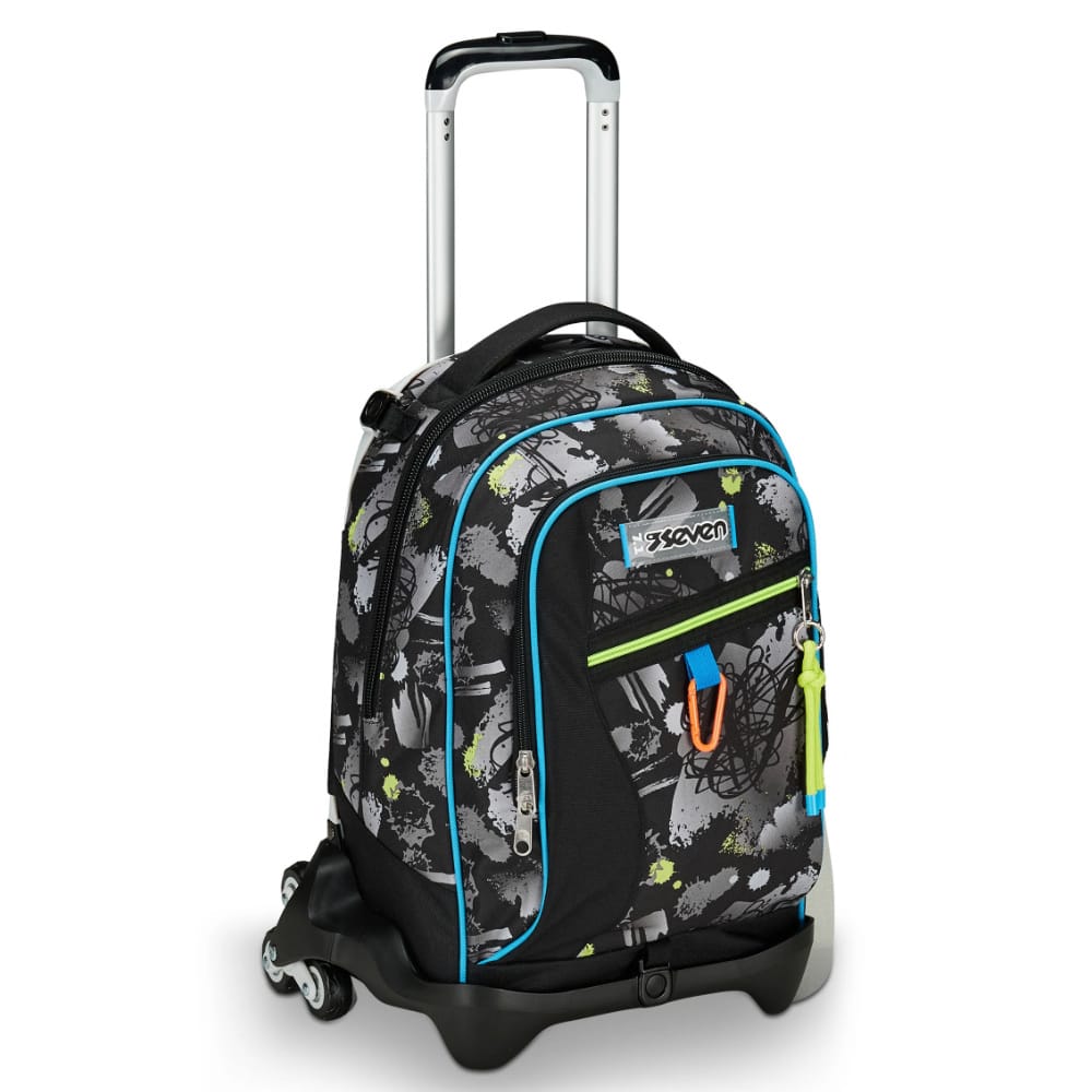 Trolley Seven Feeling Me 3 ruote separabile perfetto per la scuola media. Se hai molto peso lo utilizzi come trolley trascinandolo e se hai le scale, grazie alle 3 ruote, le superi ancora più facilmente. Se invece il peso non è molto o se hai voglia di utilizzarlo sulle spalle, stacchi la struttura del trolley e lo utilizzi come un classico zaino sulla schiena. Senza portare pesi aggiuntivi. E' super organizzato: 1 tasca grande per libri e quaderni + 1 tasca media con rete porta borraccia interna dove puoi metterci astuccio, diario e anche altri libri e quaderni + 1 tasca piccola per le piccole cose. La fantasia è pensata per ragazzi grintosi che non amano troppi colori: realizzato in nero con dettagli gialli e azzurri.