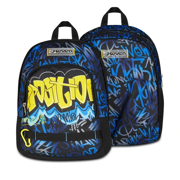 La colorazione di questo modello di zaino Seven Deatch Hidden Spot Boy raffigura tanti graffiti blu e azzurri con dettagli gialli su sfondo nero e un maxi murales giallo sul davanti.