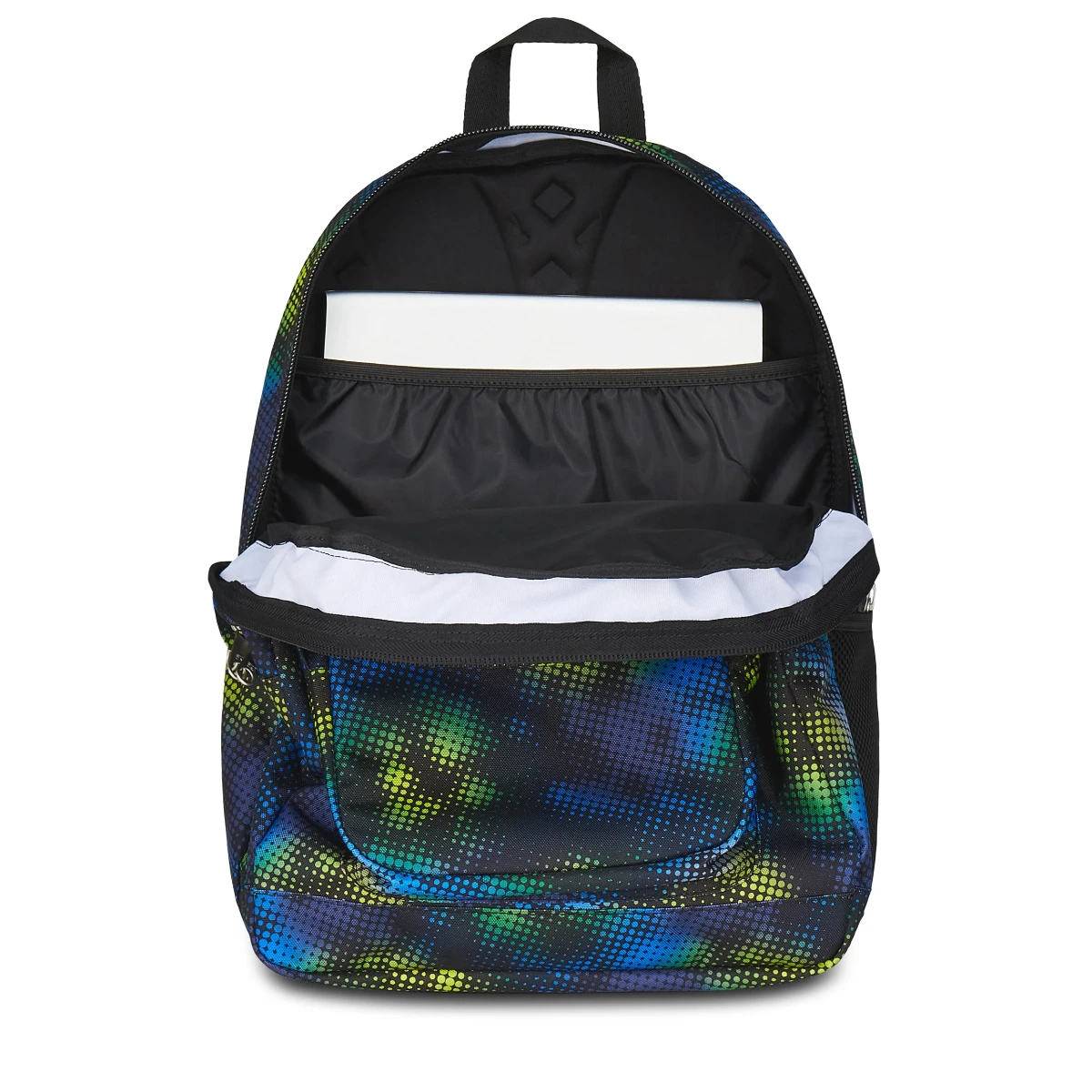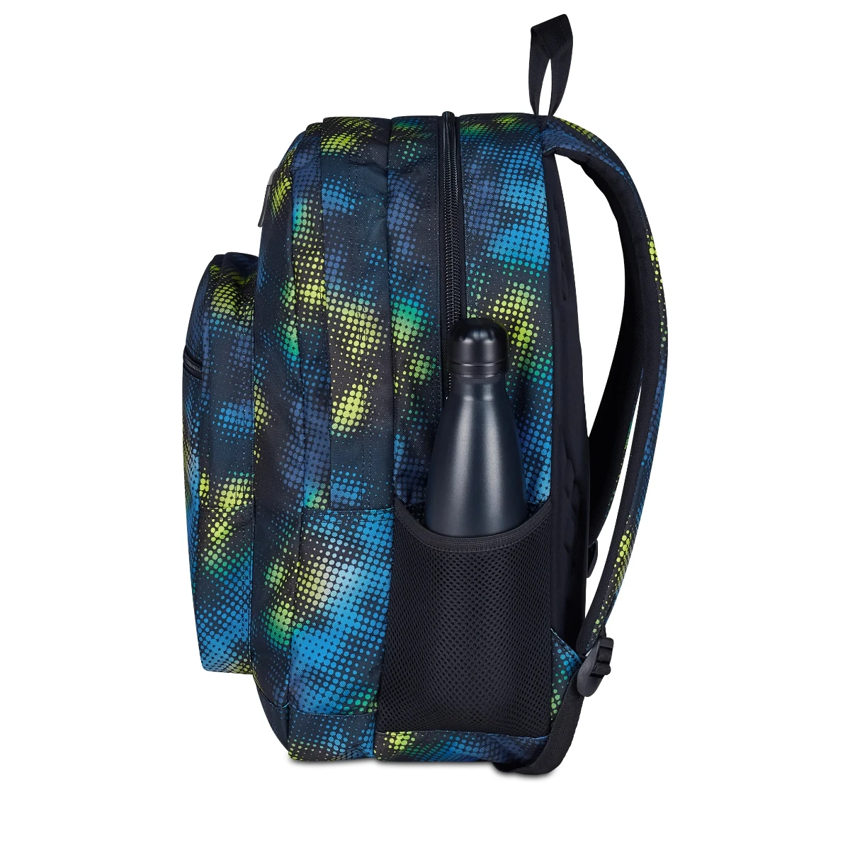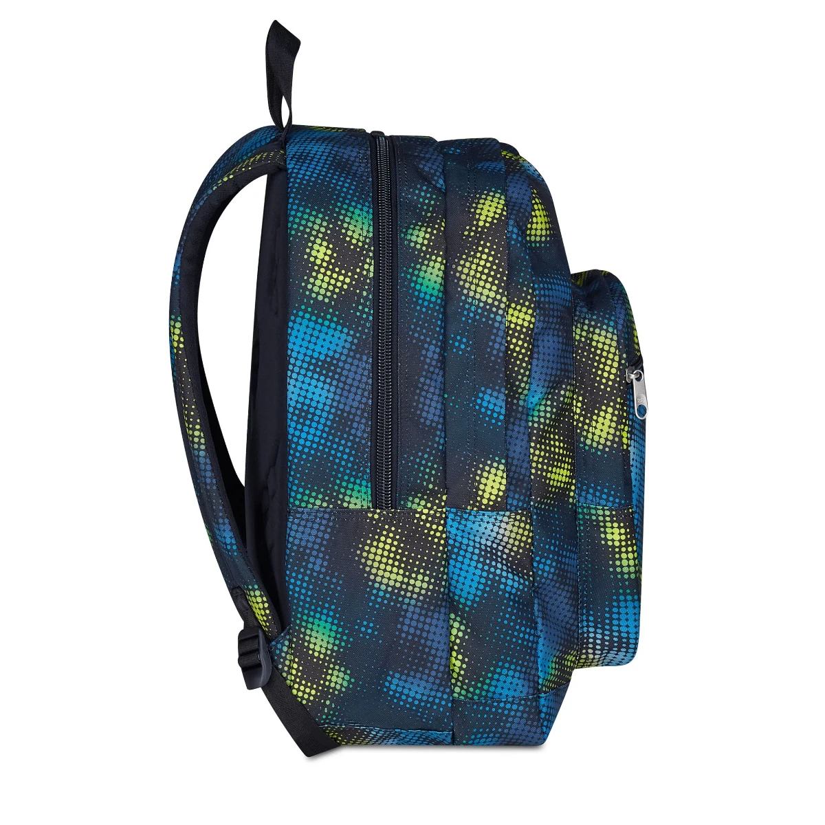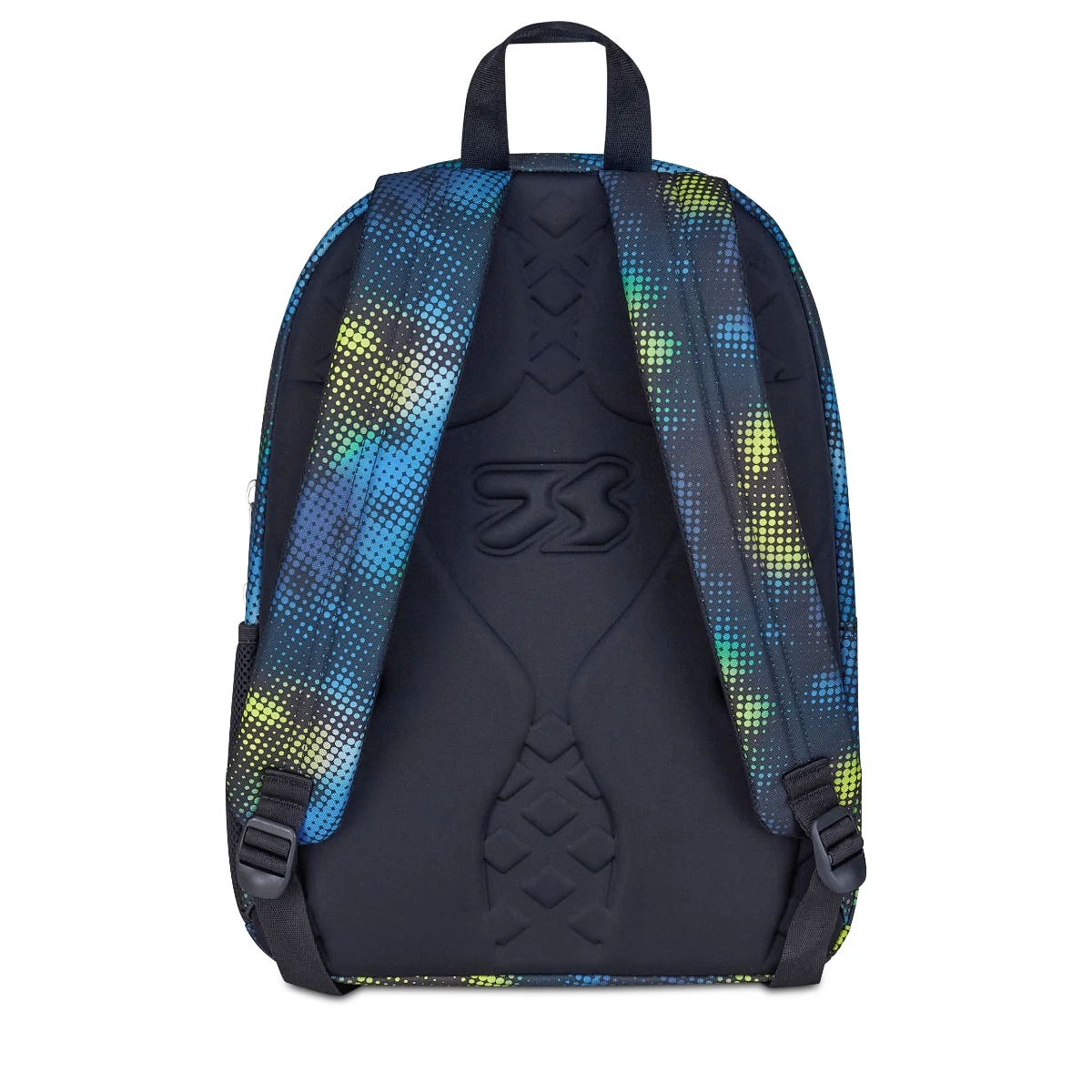 Lo zaino Seven Modello Freethink è davvero super spazioso grazie ai suoi 34 litri di spazio e alle 4 super tasche per poter organizzare al meglio tutto il tuo materiale scolastico e non solo. Due sono le tasche principali dove potrai mettere tutti i libri e quaderni. All'interno di queste trovi anche uno scomparto porta pc/tablet. In aggiunta hai anche una doppia tasca anteriore per astuccio, diario e i tuoi piccoli accessori. Ma non è finita qui... all'esterno trovi anche una comodissima tasca esterna con rete per la borraccia o l'ombrellino. La colorazione del modello di zaino Seven freethink Acid Green è realizzata sui toni del blu con dettagli verde acido. La fantasia è astratta e composta da micro puntini che danno un effetto tridimensionale e moderno alla stampa.