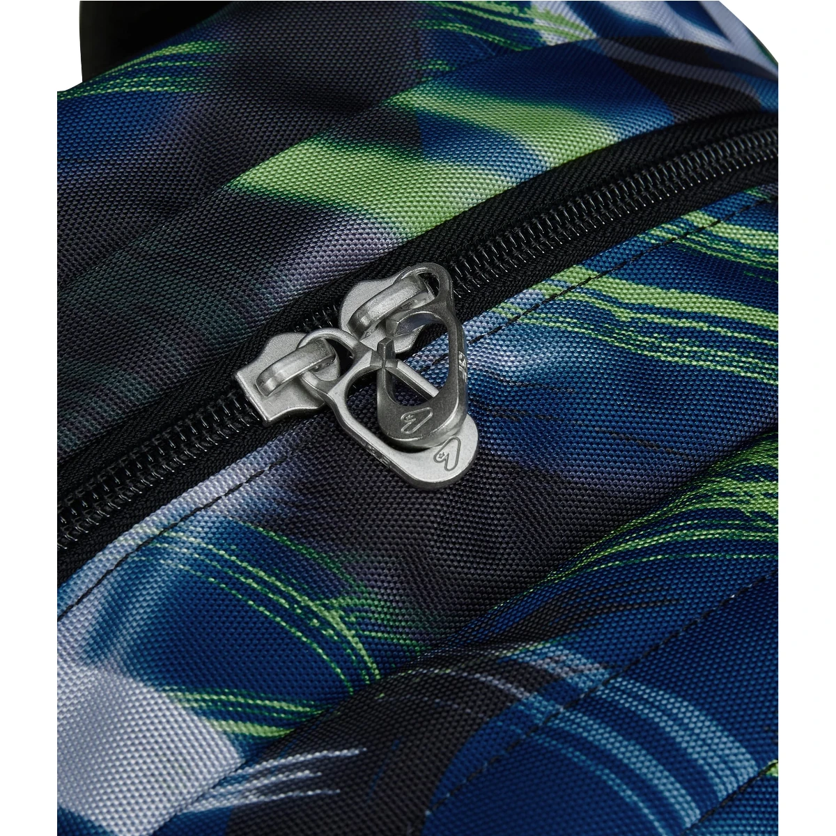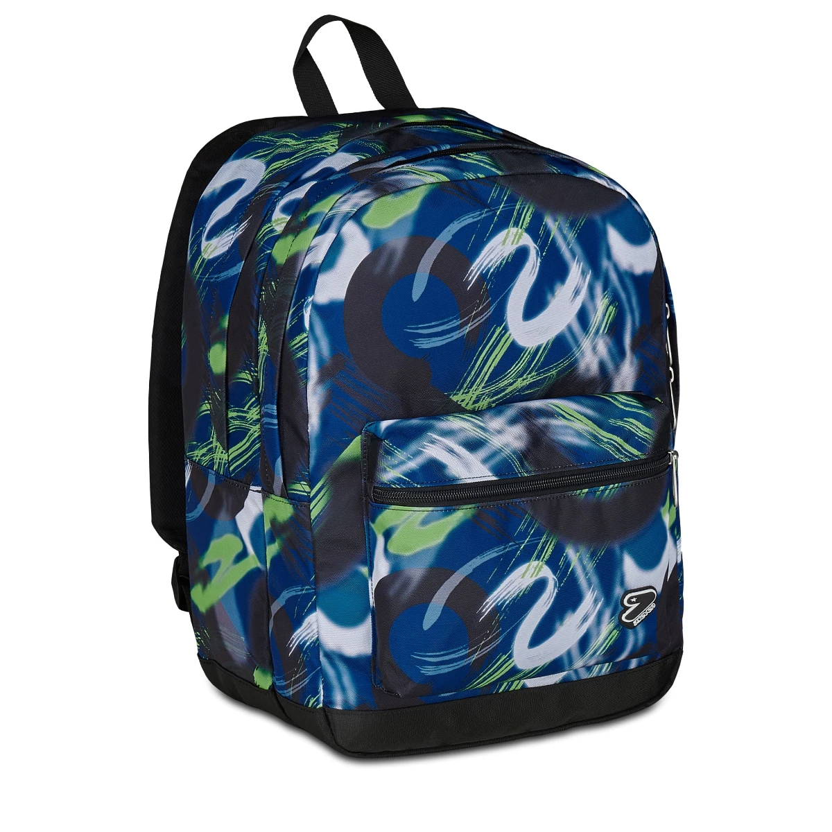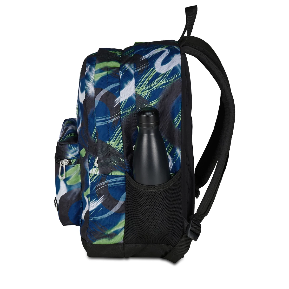 La fantasia di questo modello di zaino Seven Pro XXL Blue Deep è astratta realizzata sui toni del verde, blu e bianco con sfumature su fondo nero.